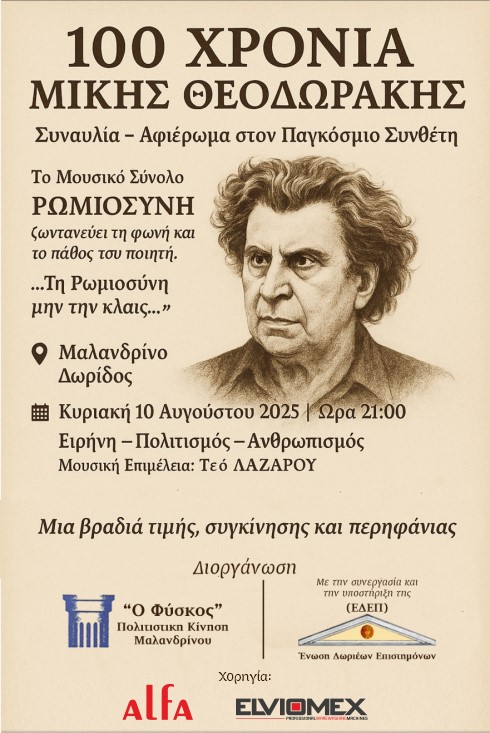 100 Χρονια Μίκης Θεοδωράκης ΕΙΡΗΝΗ - ΠΟΛΙΤΙΣΜΟΣ -ΑΝΘΡΩΠΙΣΜΟΣ Συναυλία αφιερωμένη στα 100 Χρόνια του αείμνηστου Μίκη Θεοδωράκη, ΜΑΛΑΝΔΡΙΝΟ 10 Αυγούστου, 2025 με το Μουσικό Σύνολο Ρωμιοσύνη Οργάνωση :Πολιτιστική Κίνηση Μαλανδρίνου ο Φύσκος , με την Συνεργασία και την Υποστήριξη της Ενωσης Δωριέων Επιστημόνων Ευγενική Χορηγία : ALFA EVIOMEX. Ευχαριστούμε θερμώς την Εταιρεία...