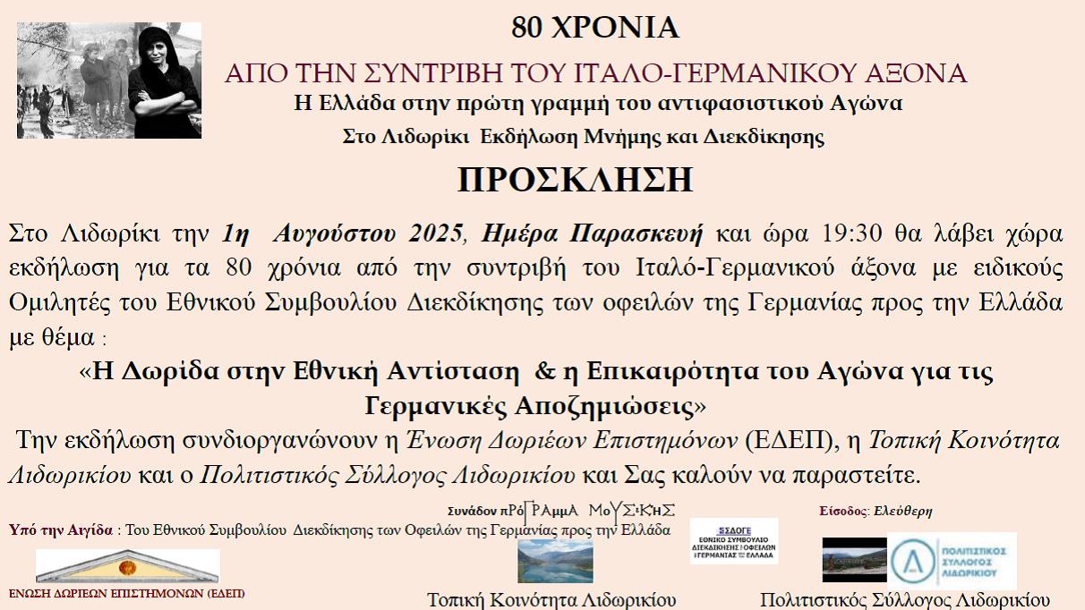 Εκδήλωση Η ΔΩΡΙΔΑ ΣΤΗΝ ΕΘΝΙΚΗ ΑΝΤΙΣΤΑΣΗ ΑΝΤΙΣΤΑΣΗ Στο Λιδωρίκι την 1η Αυγούστου, 2025 Πρόσκληση - Αφισα Συνάδον Πρόγραμμα Μουσικής, Είσοδος: Ελεύθερη Υπό την Αιγίδα : Του Εθνικού Συμβουλίου Διεκδίκησης των Οφειλών της Γερμανίας προς την Ελλάδα Την εκδήλωση συνδιοργανώνουνHΈνωση Δωριέων Επιστημόνων (ΕΔΕΠ), η Τοπική Κοινότητα Λιδωρικίου και ο Πολιτιστικός Σύλλογος Λιδωρικίου Πρόγραμμα της Εκδήλωσης Έντυπο Μεγάλη ήταν η επιτυχία της εκδήλωσης στο Λιδωρίκι για τα 80 Χρόνια από την συντριβή του Ιταλό-Γερμανικού Άξονα . Η Ένωση Δωριέων Επιστημόνων (ΕΔΕΠ) ευχαριστεί θερμά και εκφράζει τα θερμά της συγχαρητήρια στην Πρόεδρο...